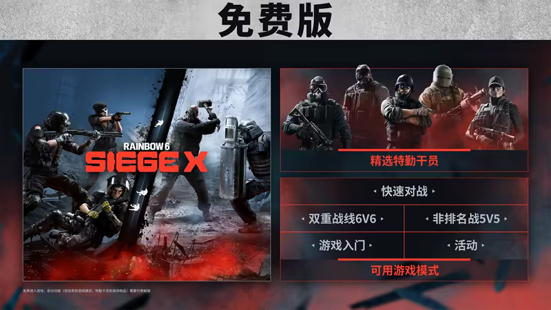 《彩虹六号:围攻X》是战术团队射击游戏中无可争议的典范,明智的策略和行动力是制胜关键。免费体验快速对战、非排名战和双重战线游戏模式,同时解锁精选特勤干员。
